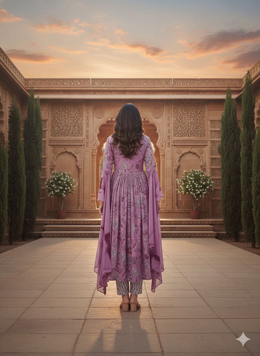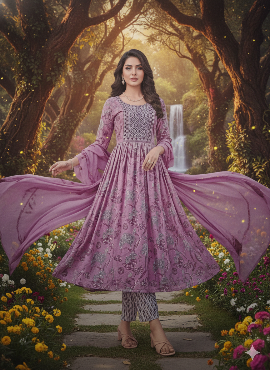 Grace meets comfort in this Mauve Floral Printed Anarkali Kurti Set, designed for women who love timeless ethnic style with a modern touch. The soft mauve hue paired with delicate floral prints creates an effortlessly elegant look, perfect for festive gatherings, family functions, and refined everyday wear.